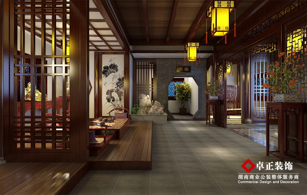 从空间上来说,中式茶楼的基本环境由接待区、收银区、工作区、休闲区、卫生间等几个部分组成,常常采用家具、绿化小品和形象塑造等对中式空间进行灵活隔断。中式茶楼可以引入古典园林设计中的亭、廊、榭、水景等元素,突出中式的文化气息,让传统中国元素符号在整个空间中得以穿插。