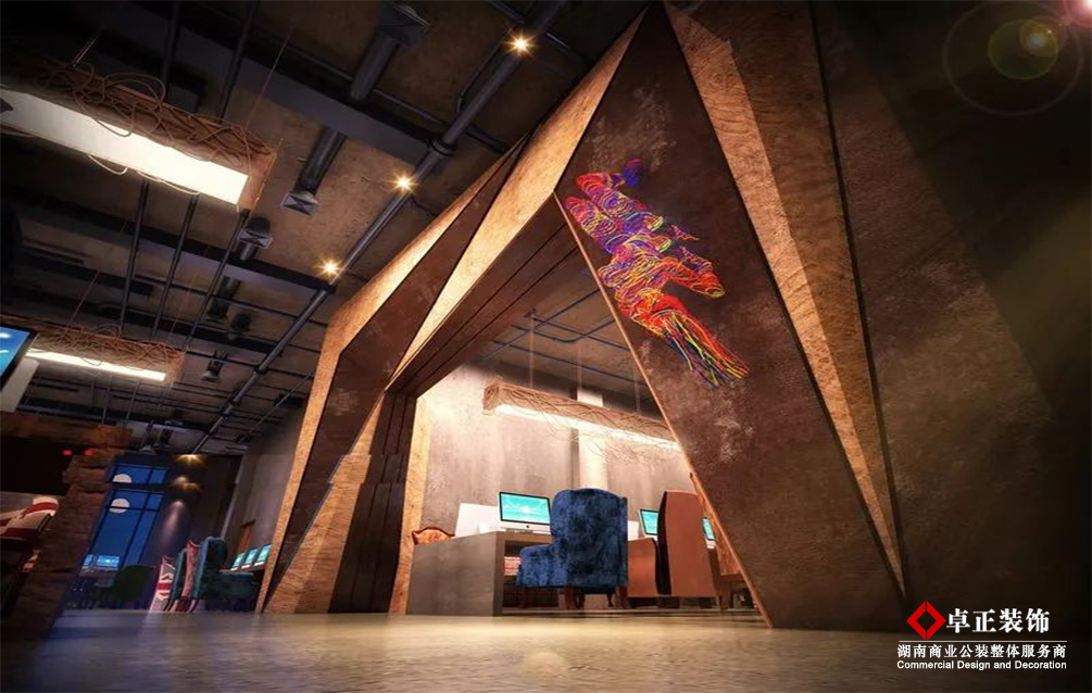 目前比较上档次的网咖,墙面均采用较为时尚的颜色和大胆的造型设计,毕竟在网咖上网的大部分人的年龄多集中在18-35岁之间。在小编认为墙面的装饰设计需要注意两点,第一就是客人进入网咖大门的墙面,第二就是网咖内比较显眼的墙面,在这两点上重点做文章及在其它墙面适当点缀就行了。